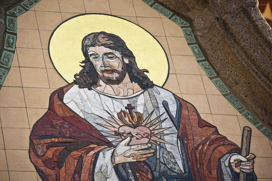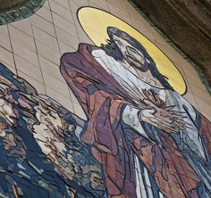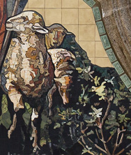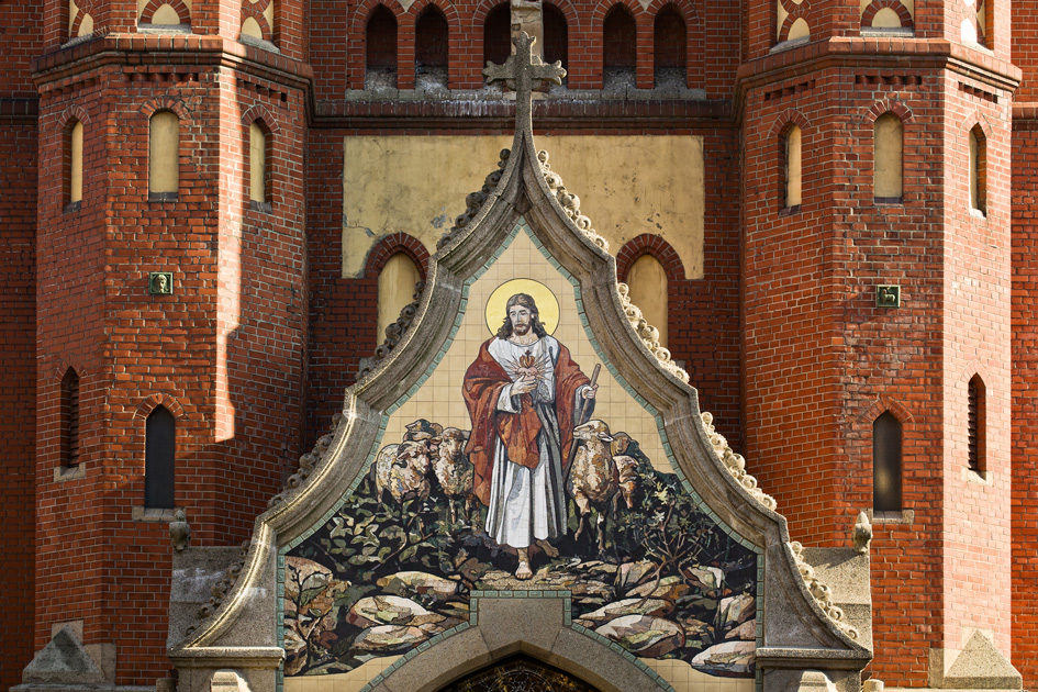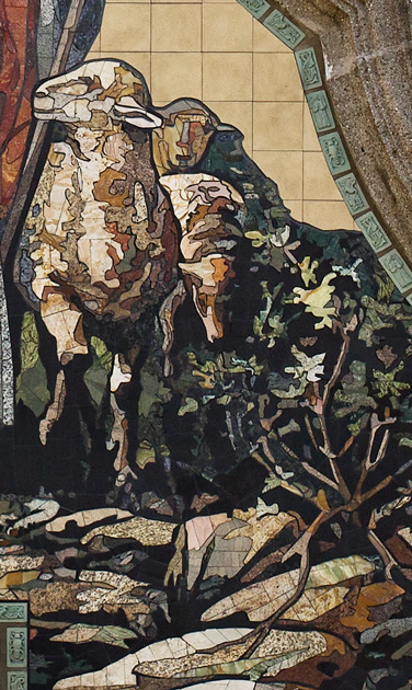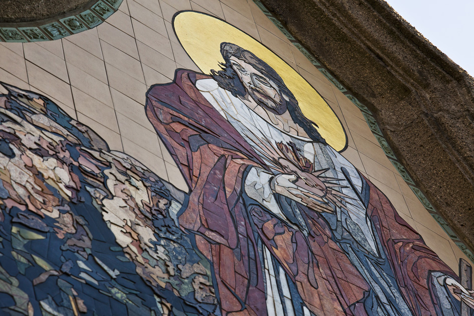 24-karatowym złotem w płatkach. Kamienna, środkowa część mozaiki wpisana jest w płaską powierzchnię z kwadratowych gresowych płytek. Całość pracy okalana jest bordiurą z niewielkich prostokątnych płaskorzeźb wzorowanych na motywach istniejących na elewacji. Ze względu na skalę realizacji, zaproponowane przez nas przedstawienie Chrystusa Dobrego Pasterza zostało dokładnie rozrysowane w skali 1:1, a następnie podzielone na mniejsze moduły, które zostały wykonywane